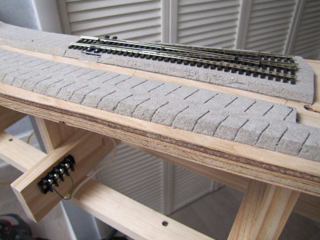 The first sign of something "scenic" - the exposed track is airbrushed at this point, to color the crossties a dirty brown, and to lessen the "plastic" look. This is done now because as the track is "brought into service", it is prepped with a 3 step sanding (600, 1000 & 1200 grit), vacuumed, then burnished with a stainless steel washer, and finally the railhead is polished with Maas Metal Polish. I'm told that this burnishing and polishing process keeps the track cleaner than the more common "scrub it with an abraisive pad" method - it makes sense to me - no fine scratches for dirt to cling to - time will tell. Much more detail is yet to come on the track, but this painting needs to be done before sanding and polishing.